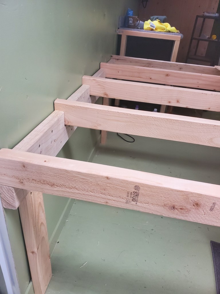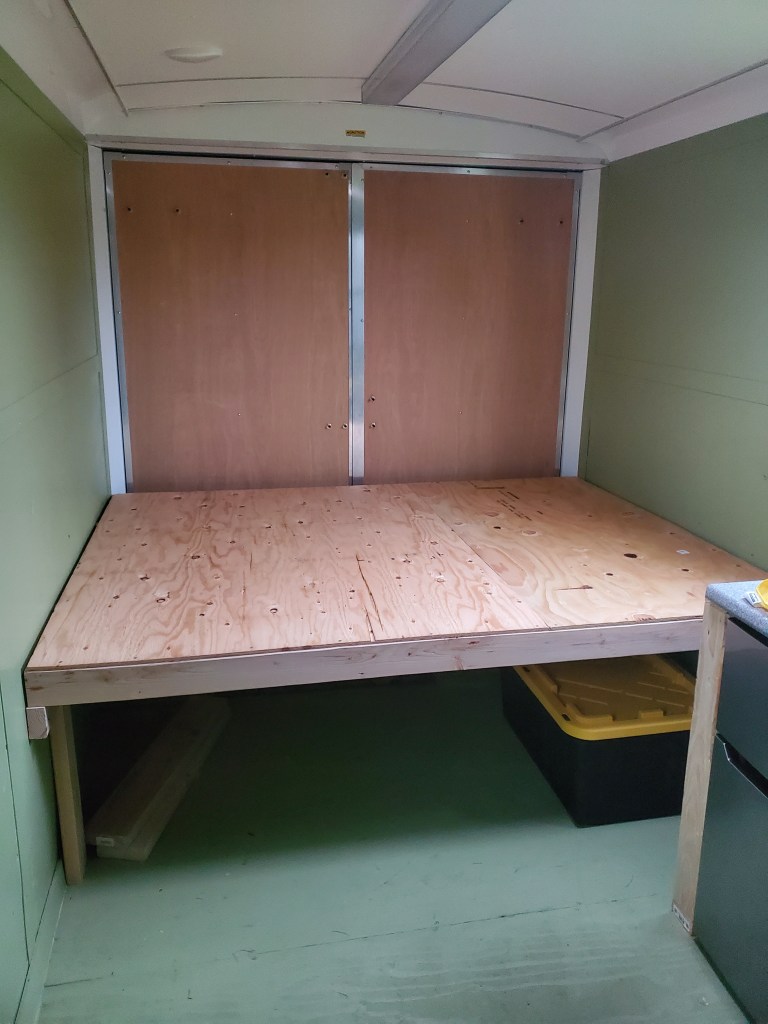 The bed frame also went in this weekend. This platform is intended to fit a queen size mattress, which may seem excessive but, again, customizing to our interests! I don’t take sleep lightly! The installation method was slotting two 2x6s for slats, then attaching them to the wall. Four floor-to-frame braces were added just for added support. 2×4 slats were cut to length, then the plywood panels were attached to the slats. This will allow the bed to slide up and out of the supports, which will allow us to remove the bed relatively easily when needed.