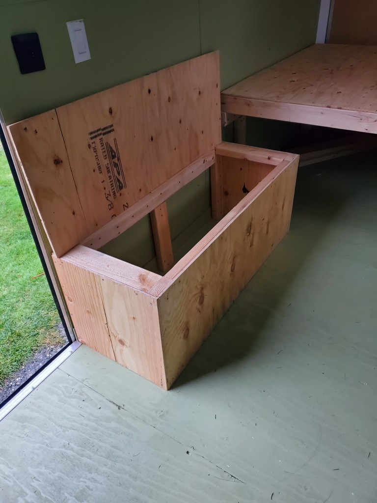 Final addition- a bench seat with storage! This will have a cushion on top, and will provide valuable storage space along with seating space.