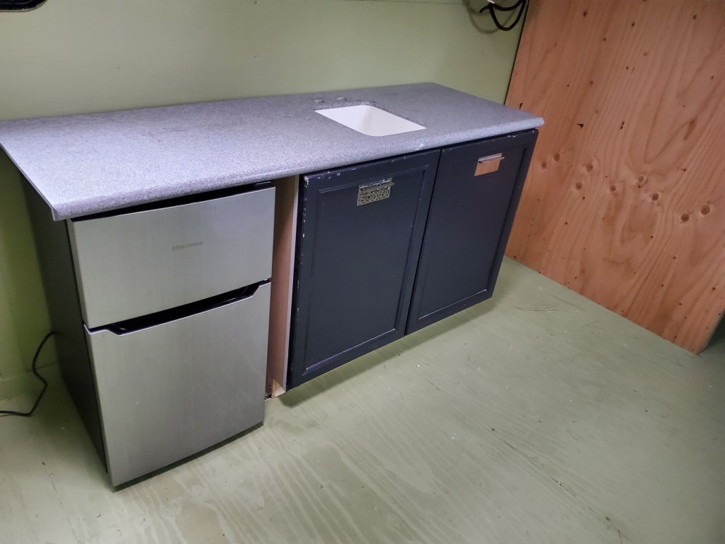 We found both the cabinet base and countertop (with sink attached) at a local re-use organization. The cabinet base has a few minor cosmetic dings, as you can see in the closer look above, which won’t matter much by the time I’m done with it. The counter and sink are Corian, which was a great find since it’s strong, lightweight, and durable. Mini-fridge is just that- a mini fridge we already had!