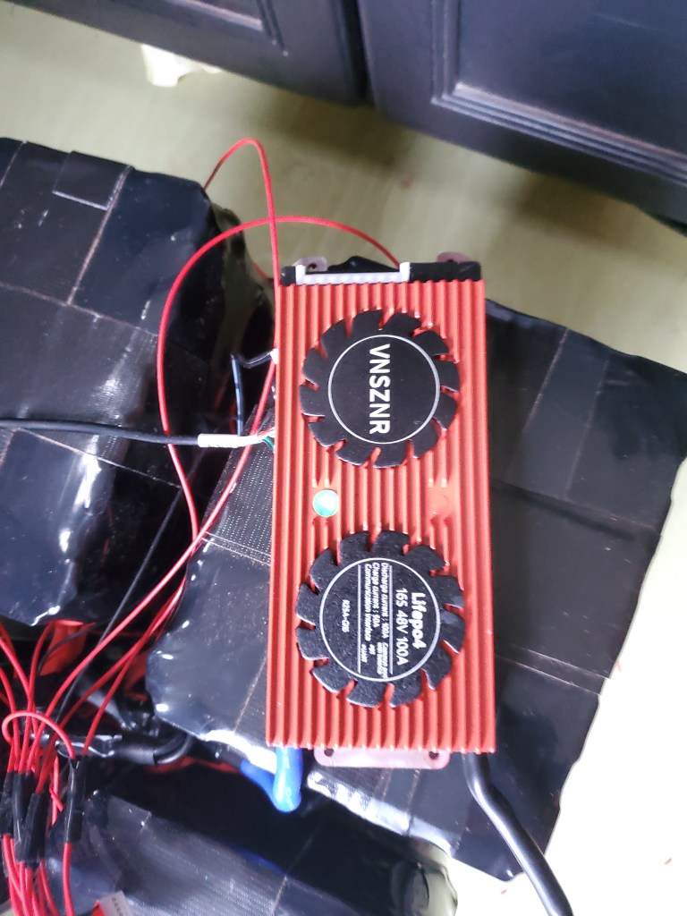 - 5 kilowatt-hour 51.2 volt LiFePO4 battery, which is self built from 16 100-amp hour LiFePO4 modules hooked up in series,